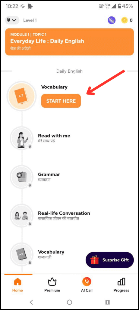 स्टेप 6. START HERE पर क्लिक करके इंग्लिश सीखना शुरू करें।